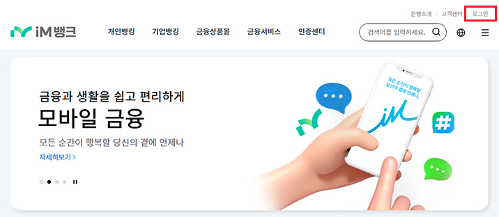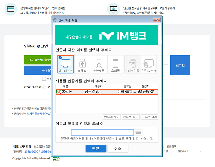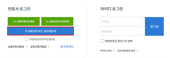 인터넷뱅킹 접속 메인화면에서 '로그인'버튼을 클릭합니다. '공동인증서(구, 공인인증서)'버튼을 클릭합니다. 본인의 '인증서를 선택'한 후 '인증서암호를 입력'하고 확인버튼을 누릅니다.